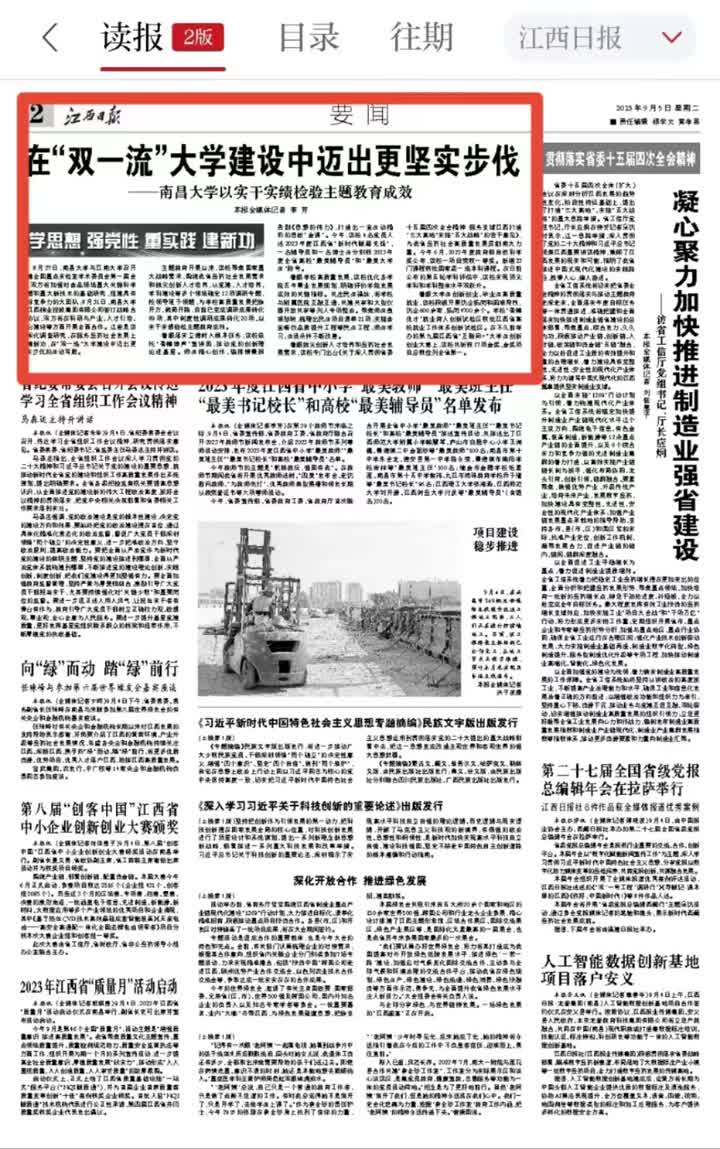 【江西日?qǐng)?bào)】在“雙一流”大學(xué)建設(shè)中邁出更堅(jiān)實(shí)步伐 ——南昌大學(xué)以實(shí)干實(shí)績檢驗(yàn)主題教育成效