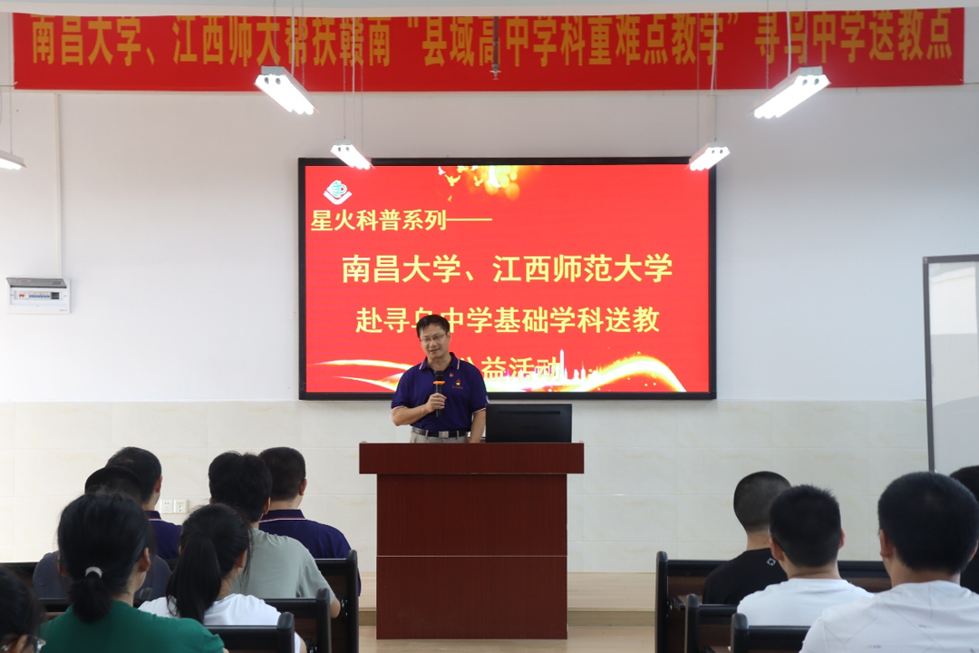 “我們既是來送教的,也是來受教的。”在開班儀式上,江西省教育廳教研室原主任,南昌大學、江西師范大學碩士生導師杜偵教授表達了此行送教的基本思想:團隊來到尋烏進行公益送教,同時接受革命傳統教育、傳承紅色基因,也是此次送教活動的重要一環。尋烏縣教科體局局長賴義紅,尋烏中學黨委書記、校長謝雙全,期盼送教團隊能夠針對基礎學科進行指導,優化教學方法,提升尋烏高中教學質量。南昌大學物理與材料學院物理系主任趙勇教授希望同學們樹立“強國有我”的理想信念,發出“請黨放心,強國有我”的時代最強音。